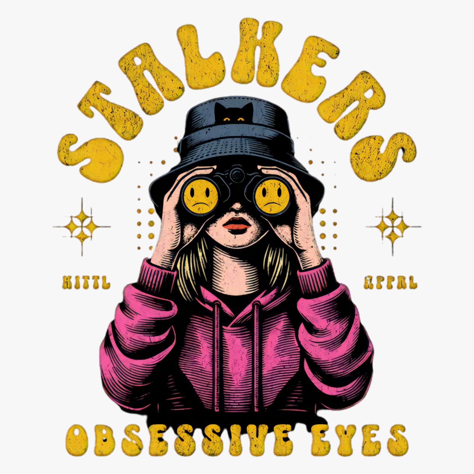 The image showcases an illustrated, cartoonish character with binoculars, wearing a hat with a cat design. The character is wearing a pink hoodie and is focused on something through the binoculars. The graphic is highlighted with retro-style lettering, reading “STALKERS” in yellow, with “OBSESSIVE EYES” placed at the bottom. The style has a fun, slightly edgy vibe, using strong contrast between the bright colors and dark background. The design has a vintage, pop-art influence, with little graphic embellishments like stars and dots scattered throughout.
